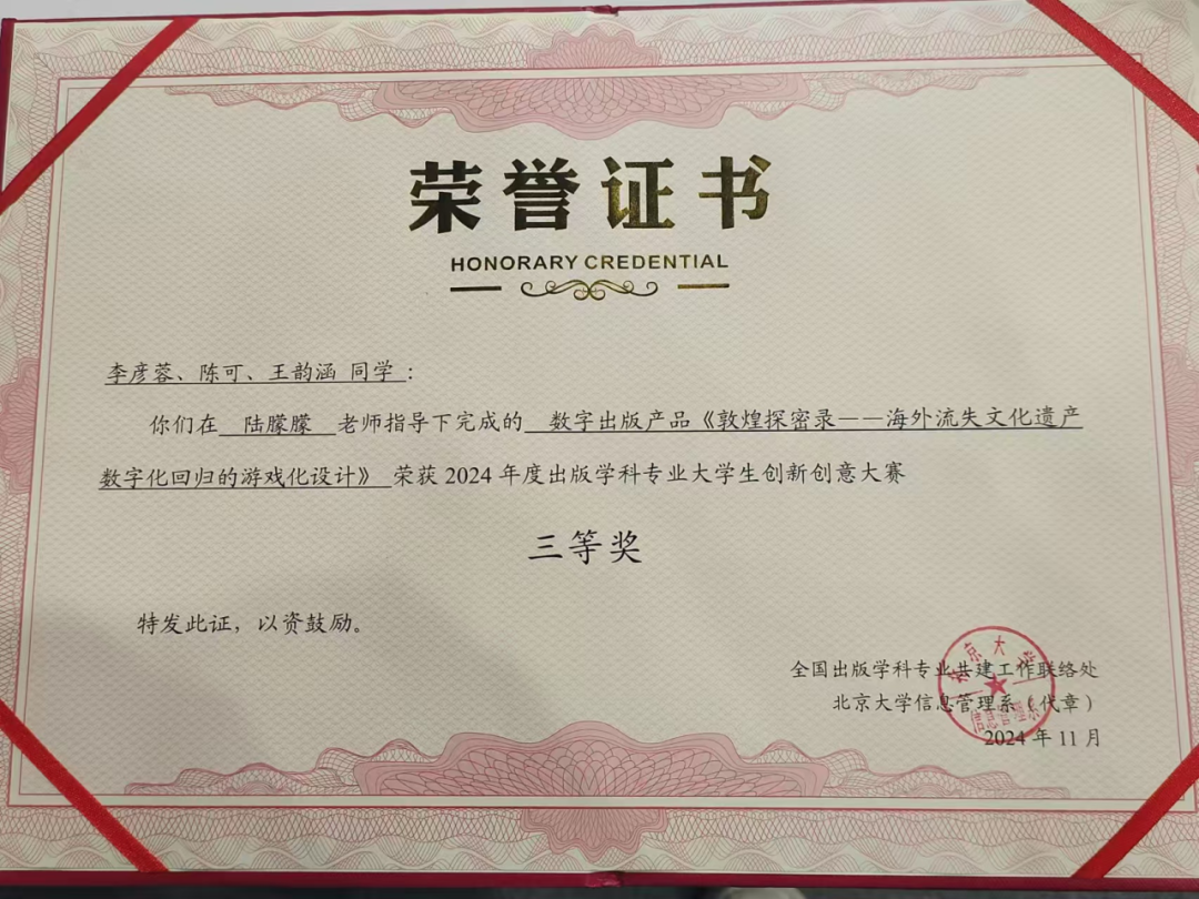会议期间,举办了2024年度出版学科专业大学生创新创意大赛展览。其中,由我院陆朦朦老师指导,2022级李彦蓉、陈可、王韵涵三位同学的团队作品《敦煌探密录:海外流失文化遗产数字化回归的游戏化设计》获得了全国三等奖。
