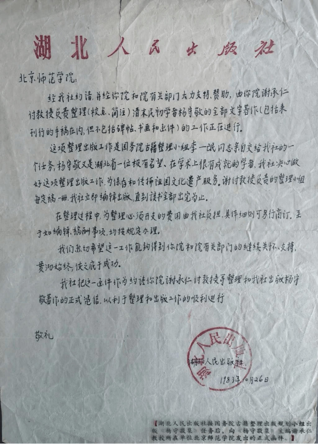 1982年,国务院古籍整理出版规划小组负责人李一氓同志建议整理出版《杨守敬集》,由北京师范学院(现首都师范大学)历史系谢承仁教授(1924-2013)担任主编,湖北人民出版社承担出版任务。