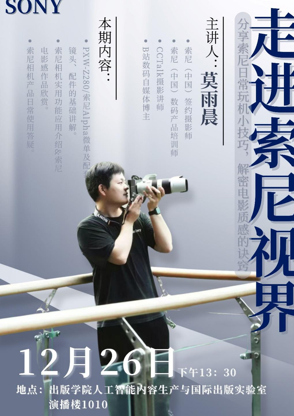 2024年12月26日下午,出版学院在新建成的人工智能内容生成与国际出版实验室,举办了“走进索尼视界”索尼相机培训讲座。出版学院邀请了索尼(中国)签约摄影师、索尼(中国)数码产品培训师、CCTalk摄影讲师、B站数码自媒体博主莫雨晨老师作主讲嘉宾,讲座吸引了出版学院20余名师生积极参与。