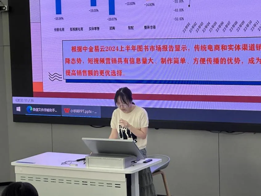 “在浙江大学出版社调研结束后,我们立刻确定了报告的主题,就是分析浙江大学出版社的新媒体营销策略。”曾晨小组在汇报时说,“我们将浙江大学出版社的新媒体营销分成了短视频营销、直播营销、达人合作推书、社群营销四个板块来分析,从中发现了一些问题,并提出了相应的建议。”