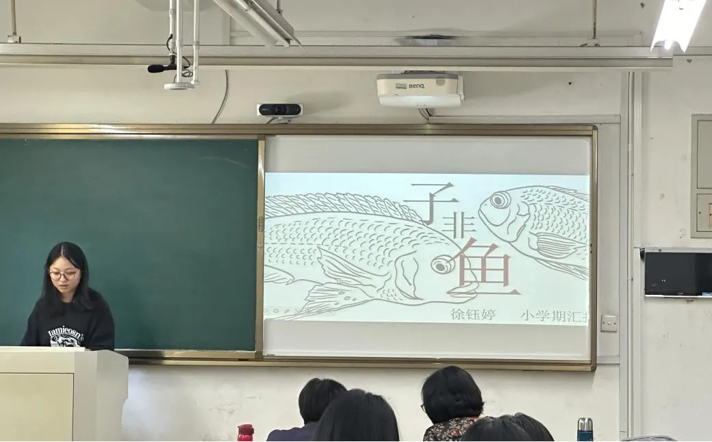 《子非鱼》是徐钰婷的小学期作品,她认为这部作品真正做到了“物尽其用”。《子非鱼》采用龙鳞装的装帧方式,外部设计成鱼的形象,内容短小而精炼,在鱼头的位置,徐钰婷还设计了开孔,能像日历一样“挂在墙上”。