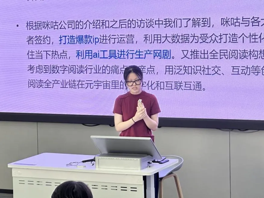 “关于咪咕数媒的调研方向和内容,我们讨论了很久才讨论出来。”雷瑜涵在汇报时说。在汇报时,她对行业趋势、用户需求、市场竞争格局、技术发展和政策环境进行了简单分析,肯定了咪咕数媒在行业内数字化的合作与创新。该组调研发现,咪咕阅读的内容同质化严重,图书质量参差不齐,影响用户阅读体验,也损害了平台的形象,希望咪咕数媒加强改进。