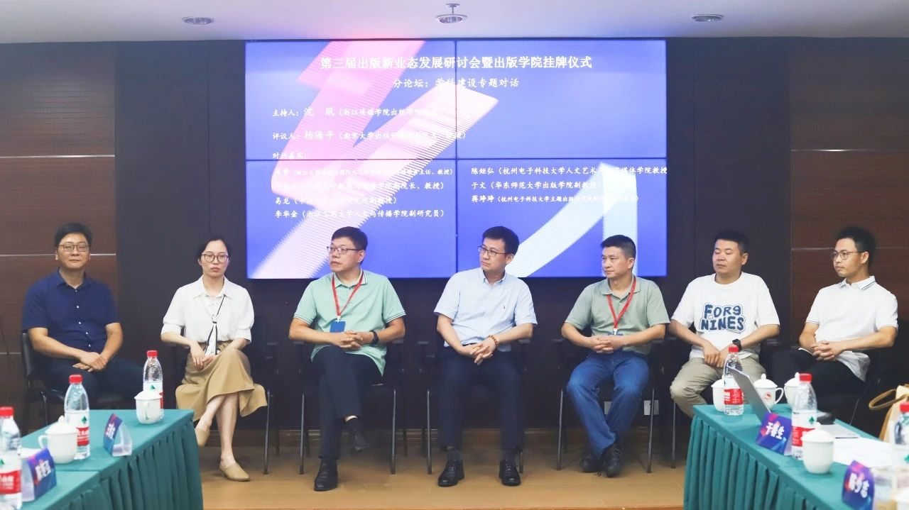 在专题对话环节中,浙江大学国际传播与文化学院新闻系主任、教授吴赟,河南大学新闻与传播学院副院长、教授于春生,华东师范大学出版学院副教授于文,中南大学出版研究院副教授易龙,杭州电子科技大学主题出版研究院副院长、副教授蒋琤琤,杭州电子科技大学人文艺术与数字媒体学院教授陈矩弘,浙江工商大学人文与传播学院副研究员李华金,对“出版学科建制化”、“智媒时代出版学科发展路径”展开相关讨论。