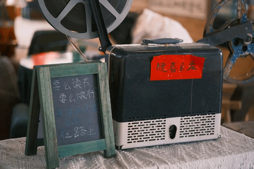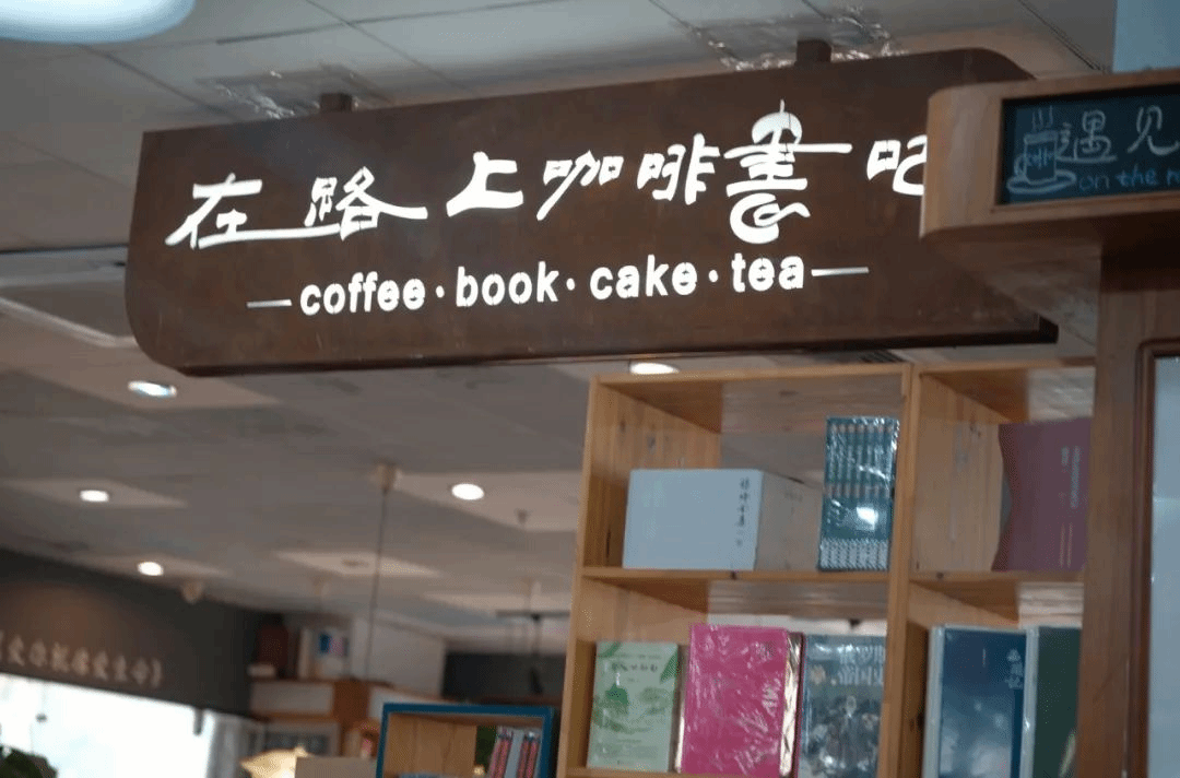 在二楼入口处,一家名为“在路上”的咖啡店引人注目。这家2016年开业的咖啡店,装饰文艺复古,兼具阅读、餐饮和休闲娱乐等功能。