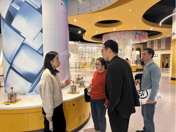 在省科技馆编辑部部长孟菲的陪同下,出版学院调研人员参观了省科技馆一至三层展厅,并饶有兴致地体验了孪生镜像等科技项目。