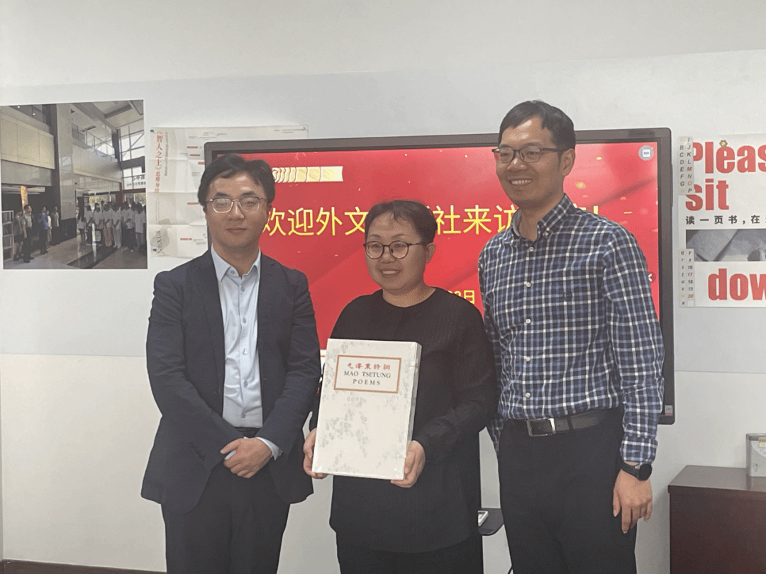 贾秋雅代表外文出版社向出版学院捐赠了《毛泽东诗词》《从甲骨文到E-publications——跨越三千年的中国出版》两本珍贵书籍。