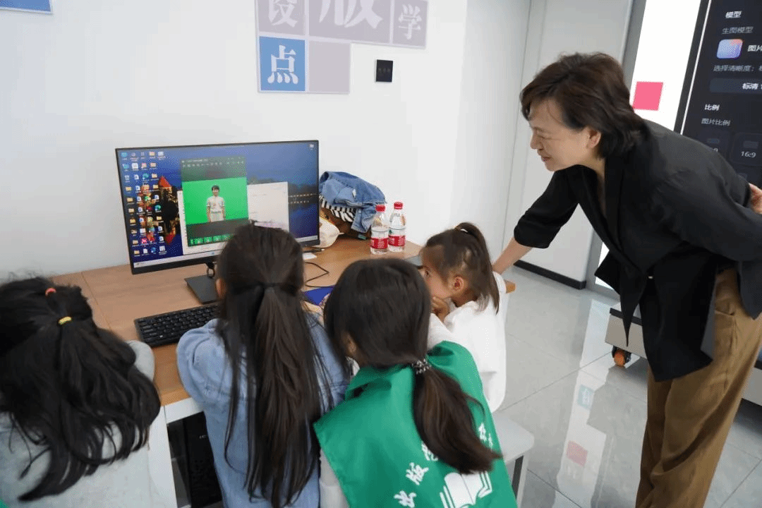 课程结束后,孩子们在实验室里通过即梦AI技术,将自己的照片导入系统,自由编辑图像,生成个性化的图片,最后将AI作品制作成独一无二的徽章。