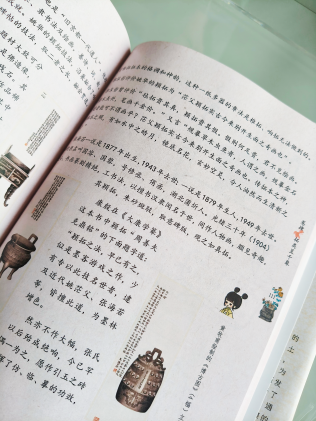 确定好主题和色调之后我们给本书增添了一些特别的设计。首先是采用了章前小漫画,是白芨与师父的对话场景,借此说明白芨本章节的探索主题,用于前情提示。其次是在目录突出全形拓最关键的要素——墨,“以墨为路”,主人公沿着这条充满文化底蕴的“墨路”探索,每过一站,每见一人,每看一物,都是一份收获。接着我们对书中与全形拓相关的部分小物件和人物等进行了手绘,包括拓印所需的材料、工具、全形拓的“专家”等等,此举也是为了丰富视觉观感,让图文更活泼。