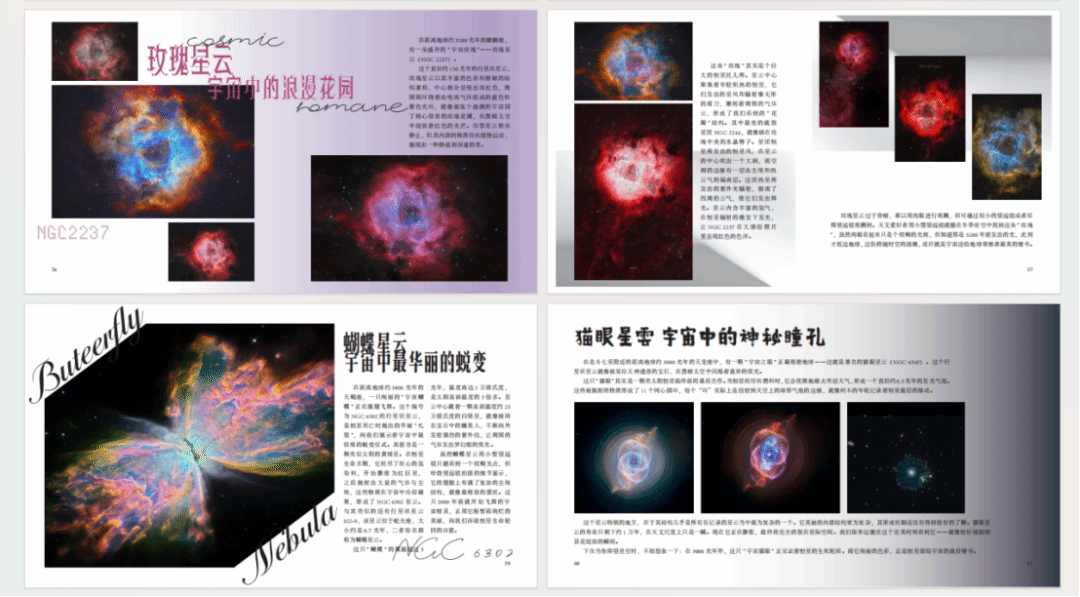 在排版设计时,我们始终希望这本书籍能成为连接读者与宇宙的视觉桥梁。宇宙的瑰丽本就该被直观呈现,因此在素材选择上,刻意加重了高清天文图片的比重——那些星云的斑斓、行星的肌理,远比文字更能传递宇宙的震撼。文字则以精简为原则,在确保科普信息完整严谨的前提下,只保留核心内容,避免喧宾夺主。色调的选择是反复斟酌后的结果,单篇文章内用适配主题的色调(如金星篇章用炽热的橙红,地球部分以静谧蓝绿凸显生命活力),页面设计也随内容灵活调整,展现宇宙瑰丽时采用满版大图营造沉浸感,文字说明页则以简洁版式突出信息逻辑,繁简之间始终保持整体的流畅性。最终呈现的版面,既是对宇宙之美的具象化表达,也试图让读者在视觉享受中自然接纳科普知识。