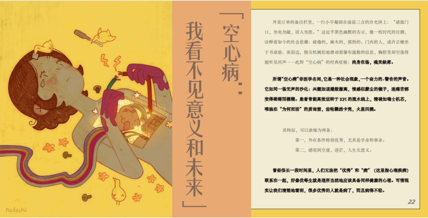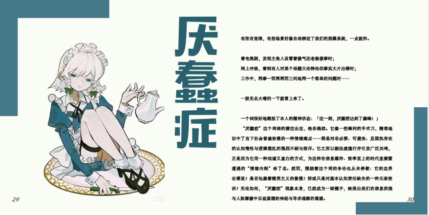 关于这本杂志的整体风格我们倾向于真诚、细腻且带有一定的趣味元素,同时也希望能够带给大家一些共情性。我们希望用平实而温暖的文字,去触碰那些隐藏在人们内心深处的情绪,让读者在阅读时能够感受到被理解和被接纳。不刻意拔高,也不刻意煽情,只是真实地呈现当下人们所面临的“非生理性疾病”以及背后的情绪与故事。