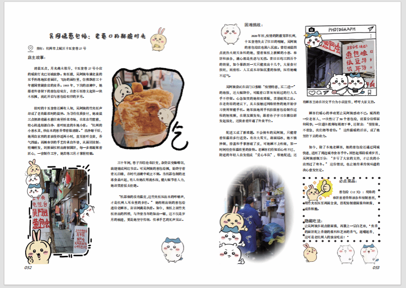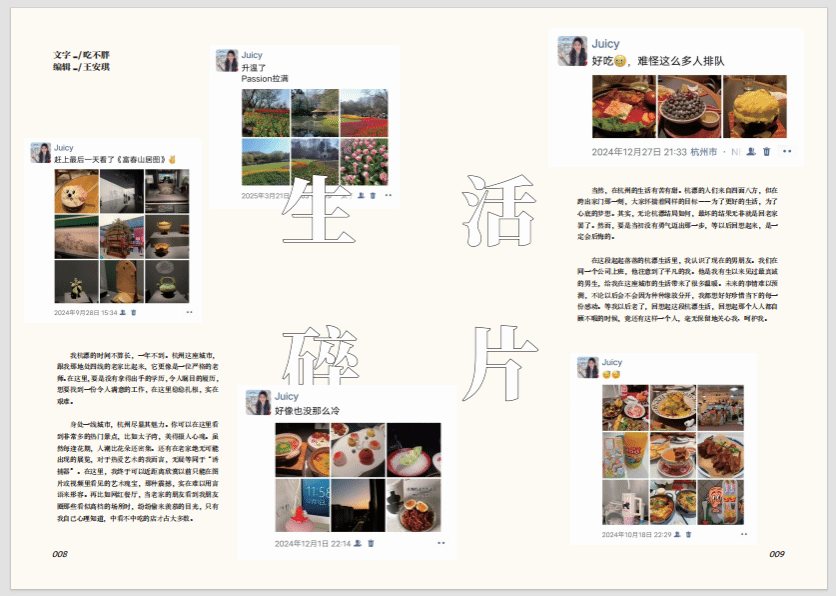 在排版和打印过程中,我们也遇到了很多困难和挑战。我们没有设计和排版的经验,使用ID排版,也是我们在不断学习的过程。如何选择合适的字体组合和字号大小,既能保持长时间阅读的舒适度,又能契合我们想要的温暖风格?如何将采访手收集到的文章和照片,统一协调地排版在版面上?如何设计简洁大方又有记忆点的文章版式?一个版面的配色、一张图片的位置调整,都可能让我们反复讨论、修改多次。但通过不断地尝试和调整,最终克服重重困难、看到成品的那一刻,收获的不仅仅是一本名为《漂栖▪在西湖的褶皱里生长》的实体书,更是一段关于编辑实务、设计思维、印刷流程以及最重要的——关于如何有效沟通协作、共同完成目标的宝贵成长经历。