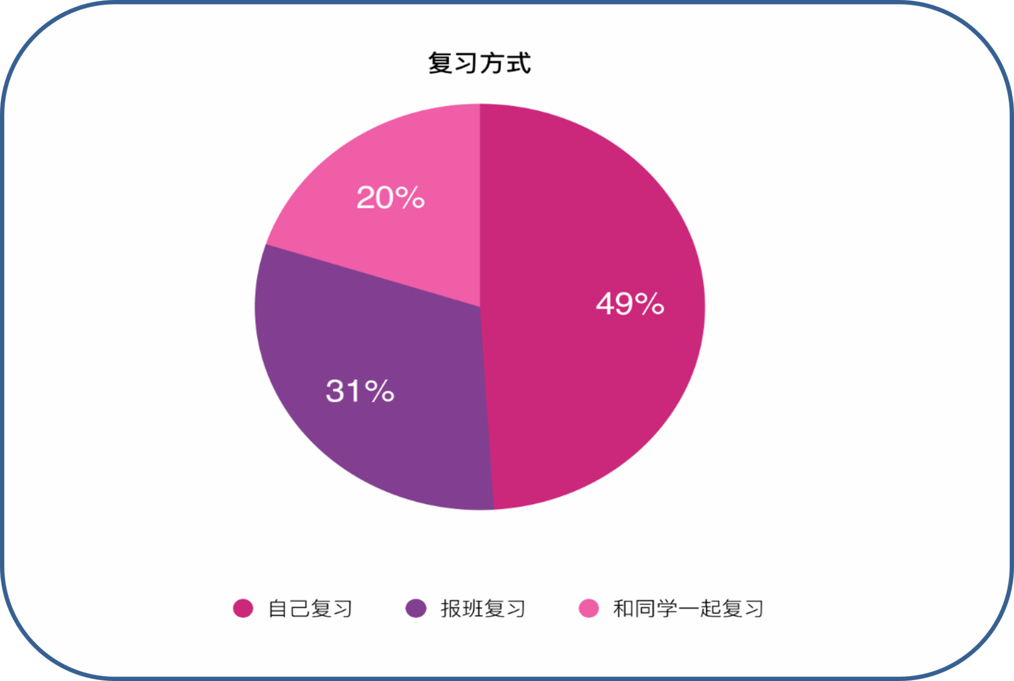 接近五成的考生选择自己复习,选择报班复习的占比接近31%,20%的同学选择和同学一起复习。