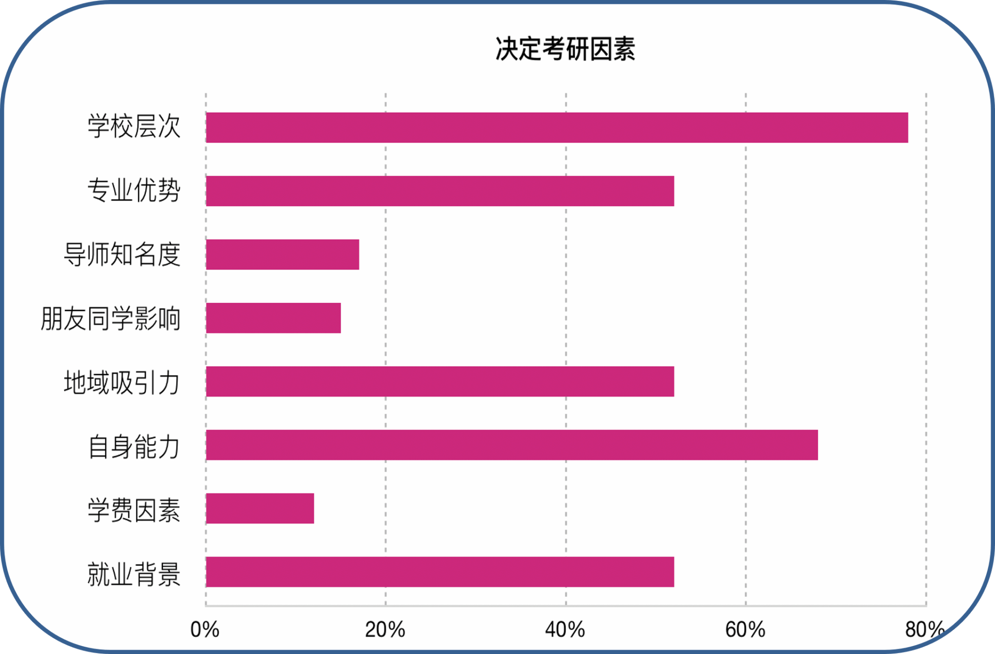 学校层次是考生首要考虑的择校因素,其次考虑的是自身能力,第三则是专业优势、地域吸引力和就业前景。