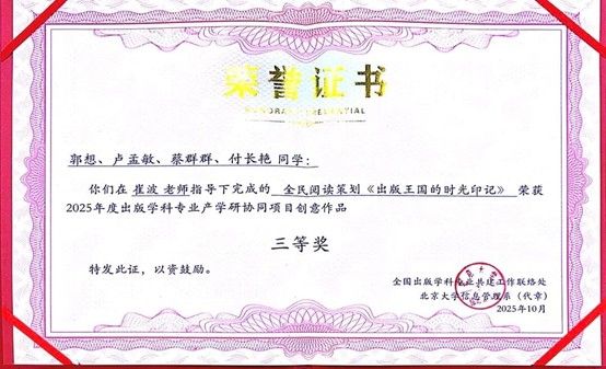 作为重点发布内容之一,2025年度出版学科专业产学研协同项目围绕课题研究、学术论文和创意作品三大类别进行遴选,分别有10项课题获得立项,7篇学术论文入选,14件创意作品获奖。其中,我院2021级编辑出版学2班郭想、卢孟敏、蔡群群、付长艳同学在崔波老师指导下完成的纸质书作品《出版王国的时光印记》荣获2025年度出版学科专业产学研协同项目创意作品三等奖。