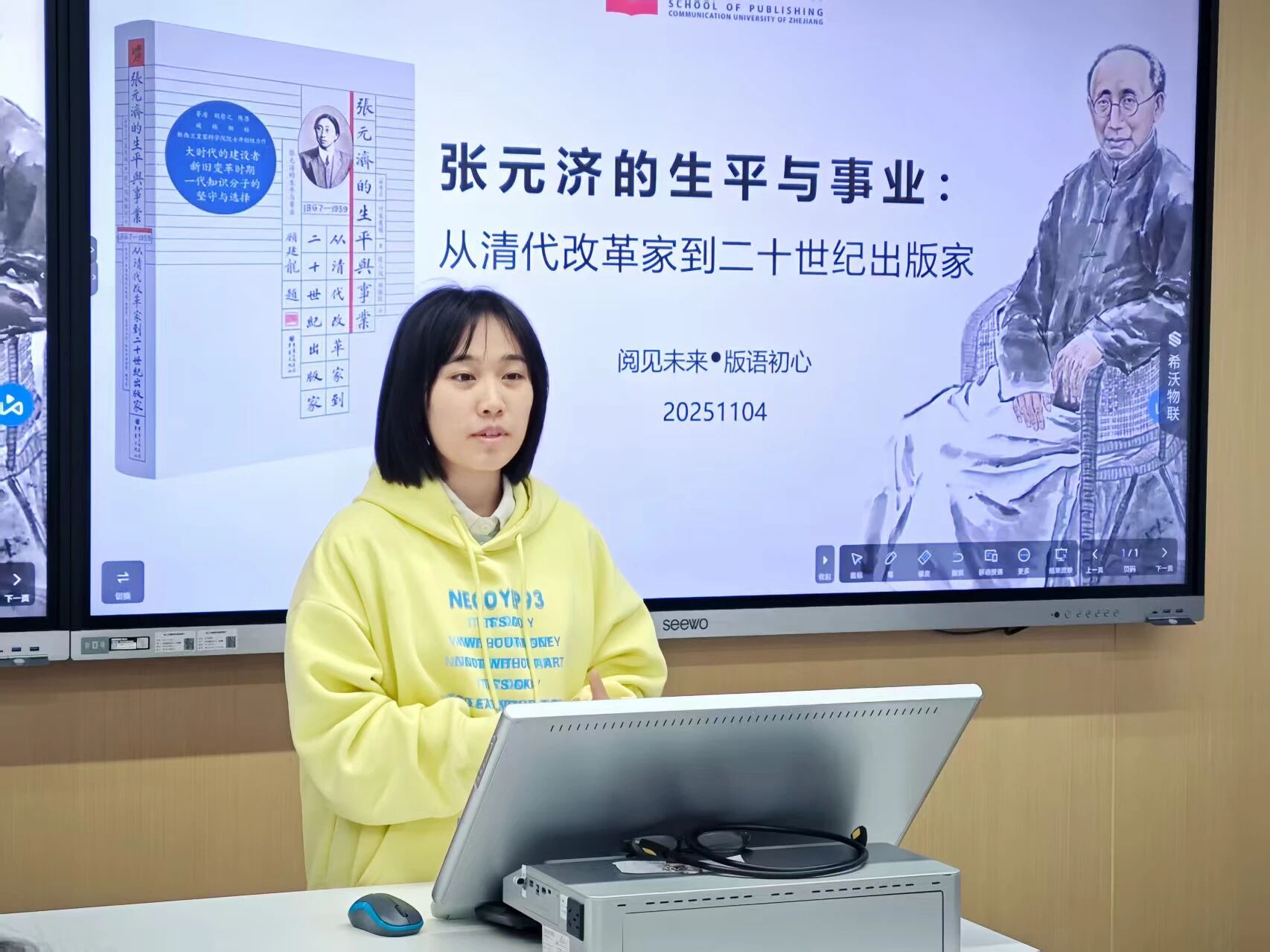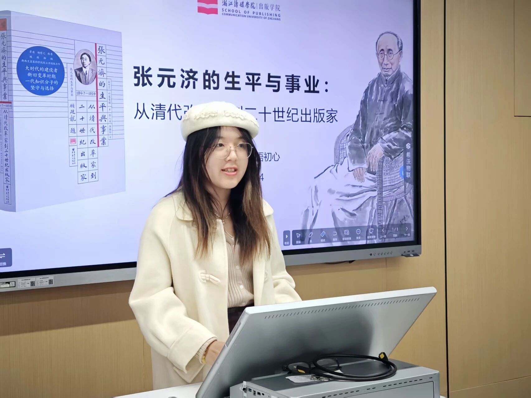 2025级研究生史一妤从新闻学视角切入,以“文化传承者”“出版革新者”“教育践者”“家国担当者”四个关键词解读这本书。她坦言,从新闻学转向出版学并非放弃初心,而是找到更长效的践行路径——新闻学教会“用信息凝聚共识”,出版学教会“用书籍留存精神”,张元济的故事让两种价值紧密相连,她表示将以张元济先生为榜样,补出版短板、强新闻优势,用媒介融合思维扛起文化传播的责任。