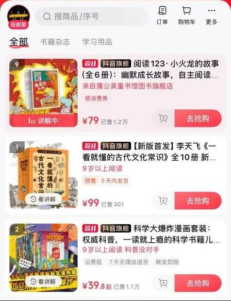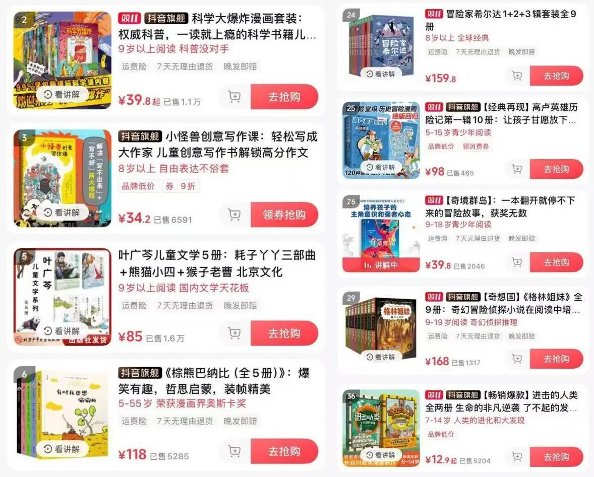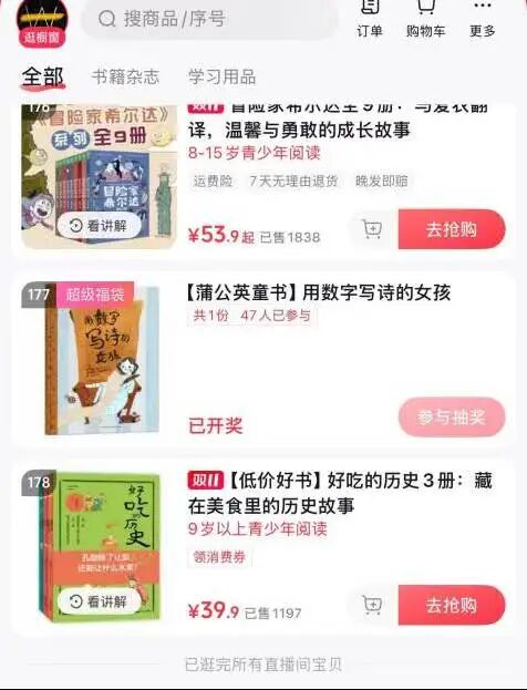直播间工178款商品,垂直品类全覆盖,满足分级需求。从学龄段划分,包含幼儿园到四年级以上的分级读物;从功能划分,涵盖启蒙认知、课内拓展、课外阅读、开学必备等类型,能满足不同阶段孩子的阅读需求。