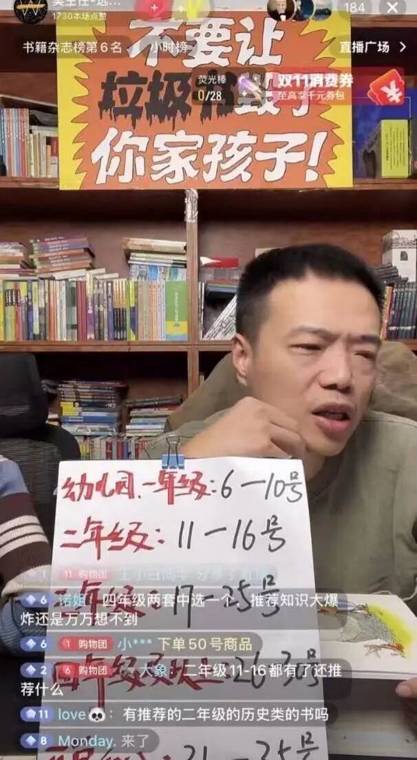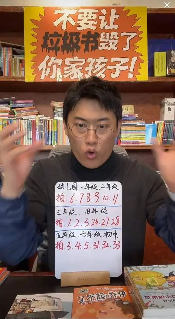 背景书架上粘贴的标语牌“不要让垃圾书毁了你家孩子!”,直接击中家长“怕选错书”的核心痛点,这句标语能让他们快速认同主播的选书理念,从而更信任后续的推荐。