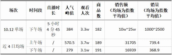 从10.10-10.13的日均场直播数据来看,上午场的销售额指数和销量指数高于下午场,说明上午场的直播总体效果更好,这很有可能于直播人气和观看直播人数相关。