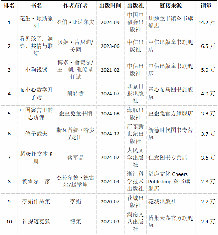 从以下梳理出来的吴主任-选书超严的账号图书销售榜可以清晰地看出,销量前十的书籍来自于各个出版社和各个店铺,说明其选品种类多,不局限于一个出版社,更能让用户相信其选品较好。