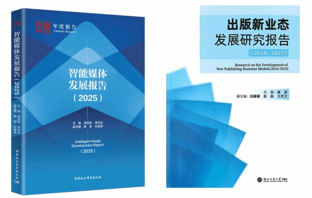 从左到右依次为:《智能媒体发展报告2025》《出版新业态发展研究报告(2024-2025)》