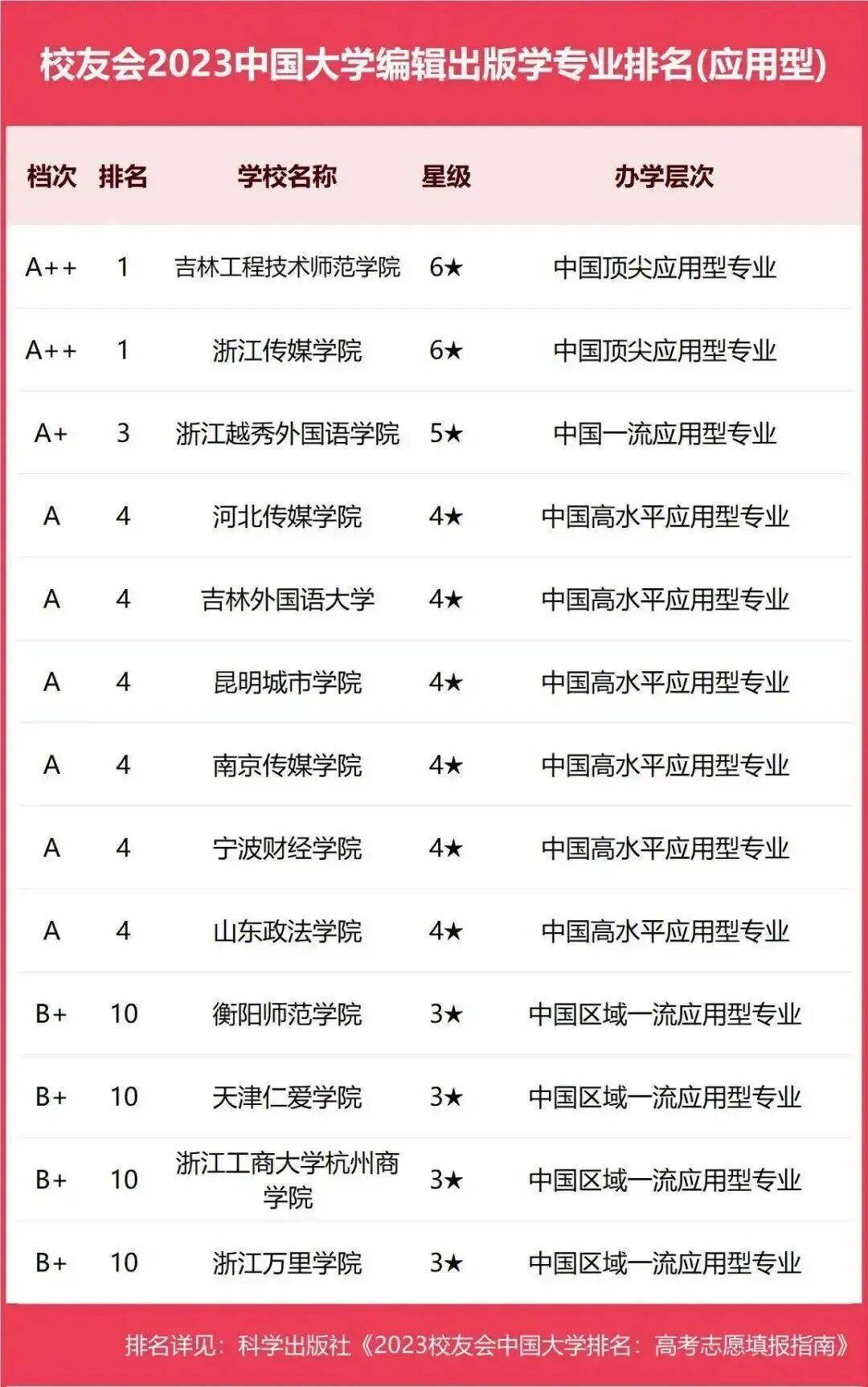编辑出版学专业被评为6星级、A+层次专业