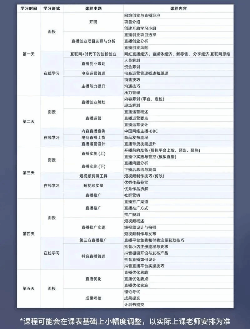5个全天的面授课程。直播筹划、选品分析、展示推广等干货,助你成为水灵灵的“带货主播”��,别再犹豫,抓住政策的东风,开始是最重要的!