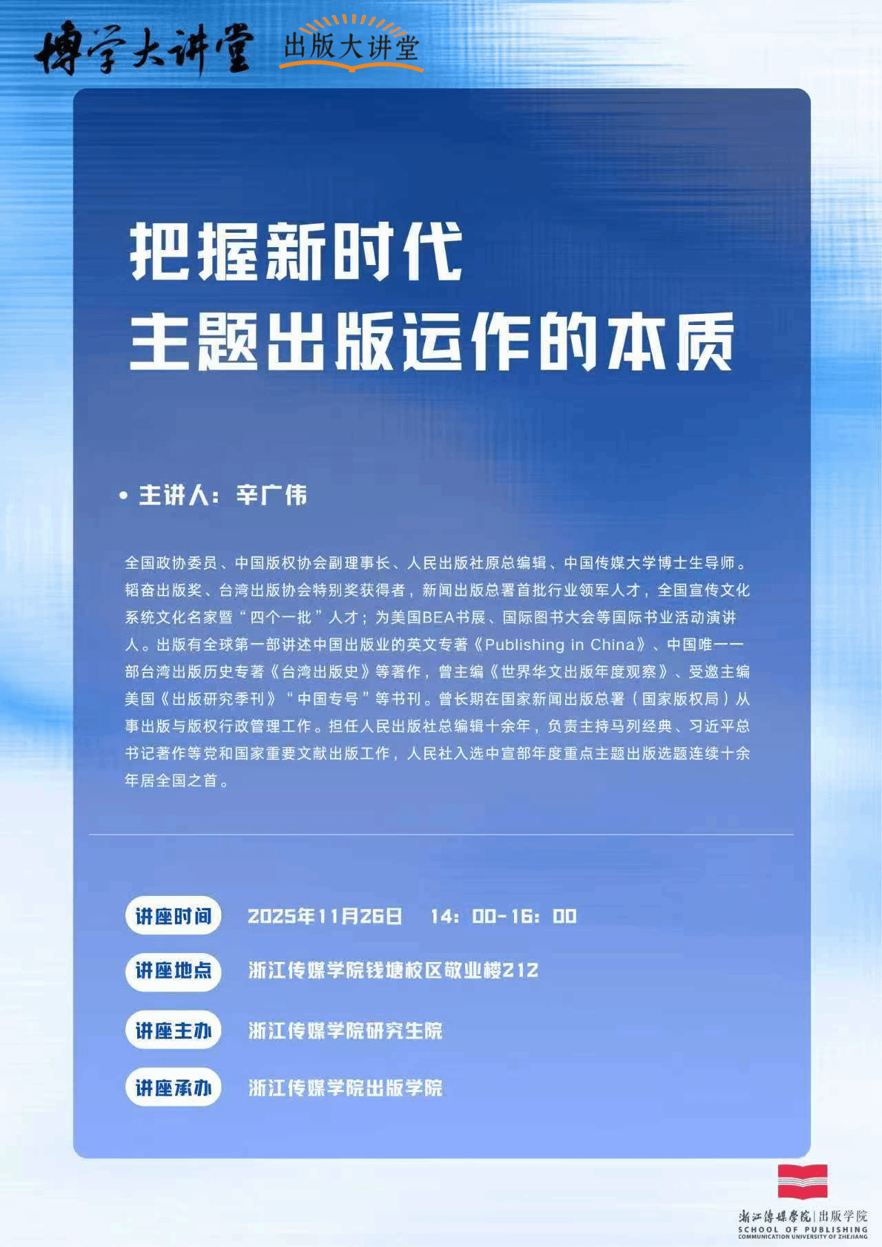辛广伟,全国政协委员、中国版权协会副理事长、人民出版社原总编辑、中国传媒大学博士生导师。韬奋出版奖、台湾出版协会特别奖获得者,新闻出版总署首批行业领军人才,全国宣传文化系统文化名家暨“四个一批”人才;为美国BEA书展、国际图书大会等国际书业活动演讲人。出版有全球第一部讲述中国出版业的英文专著《Publishing in China》、中国唯一一部台湾出版历史专著《台湾出版史》等著作,曾主编《世界华文出版年度观察》、受邀主编美国《出版研究季刊》“中国专号”等书刊。曾长期在国家新闻出版总署(国家版权局)从事出版与版权行政管理工作。担任人民出版社总编辑十余年,负责主持马列经典、习近平总书记著作等党和国家重要文献出版工作,人民社入选中宣部年度重点主题出版选题连续十余年居全国之首。