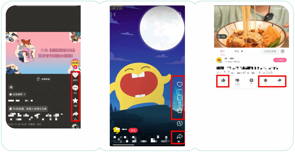 2、主办方将按抖音、B站、小红书总共的互动量(如下图标记)(50%);创意(30%);视频质量(20%)三个维度进行评审,数据统计截止至2026年1月19日;最终评审结果将于2026年1月31日前在微信公众号【出版视界】公布。