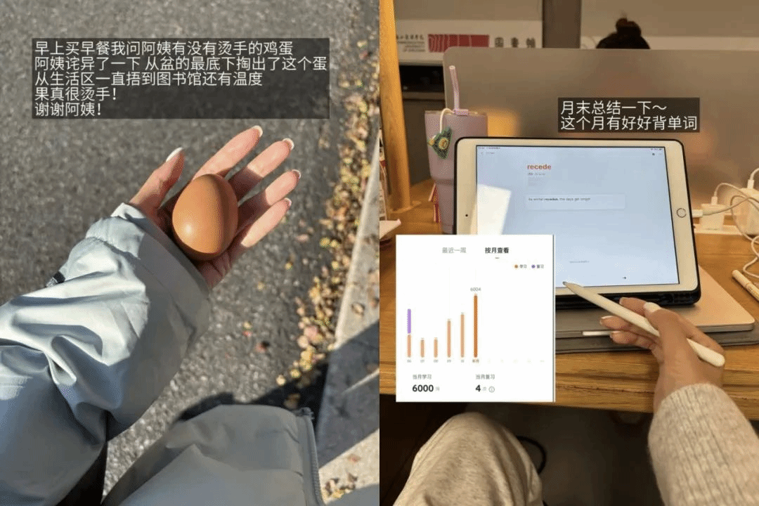 考研备考是一个长期的过程,在如此漫长的战线里,人不可能一直是紧张的,不然就会像一根绷紧的细绳,早晚会断裂。潘美彤深知这一点,即使学习任务再繁重,她都会将生活中一些有趣的小事记录下来,配上生动的语言和emoji,以plog的形式发布到社交媒体上。对她而言,这些被记录下来的小美好,和主线学习任务一起,点点滴滴构成了她这段时间生活的全貌。生活正是如此,如果主线任务有点困难,那么不妨为自己寻找一些充满乐趣的小支线。