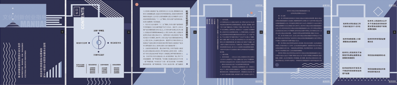 在学院崔波老师、王武林老师的悉心指导和学院各位辅导员老师对各个项目与竞赛申报的帮助下,这个创业项目先后获得了第九届“创智风云·赢在浙传”大学生创业大赛优秀奖、创业实践组第三名,国家级大学生创新创业项目立项,校级大学生创新创业项目立项,浙报-阿里极客计划项目立项和杭州市大众创业项目立项。在校就业指导中心与校产业园的支持下,我也注册了自己的公司,只是在这一过程中,我发现虽然那时杭州对青年创业扶持政策众多,但信息分散、流程复杂,作为一位尚对工商行政一头雾水的在校大学生,为了确认各项创业补贴的申请条件与申请方式,理清工商财务注册登记流程,不知跑了多少趟工商与市民中心,打了多少通咨询电话。也正是这段经历让我决定制作一本系统整合创业政策、行政流程与相关专业知识的数字手册,希望大学生创业者们可以用一本数字出版物就能搞定那些曾让我焦头烂额过太多日夜的所有问题。这一选题甚至让我在看到几年后改版升级的“浙里办”应用因其行政信息的集合性与“最多跑一趟”的便捷性出圈时,都不禁会心一笑。因为体会过通过出版思维解决实际问题的成就感,也因为大学时的愿望已然被完美实现了。