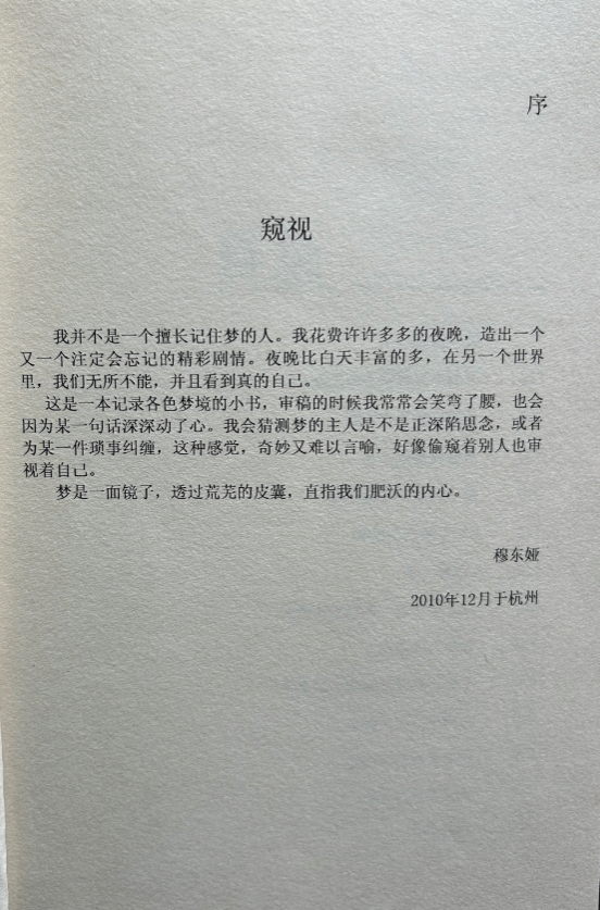 提起大学生活,最绕不开的人便是好友穆东娅,就连这篇文章都是出自我们的“共享记忆”,“四年一本书”也是被细心的她保存得完好如初。当她发来图书的照片,我再一次小小地“骄傲”了一下,这本书的书名为《一零一夜》,由我俩共同撰写,记录了各种各样的梦境,按照不同类别分为“黄粱一梦”“梦回唐朝”等几个篇章,文字青涩又个性鲜明。我把封面、目录和部分正文分享给同事,同事评价:“甚至比很多市场上的书都更有吸引力!”虽知别人出于礼貌,但我仍偷偷满心欢喜。
