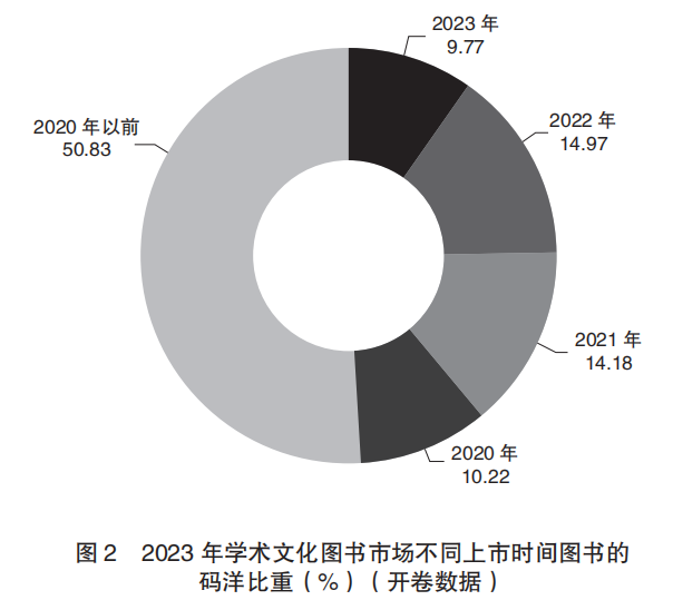 但值得关注的是,学术文化类图书的码洋增长,更多源于老书的带动。其中2020年以前的图书码洋比重超过50%,2023年新书码洋占比不到10%(见图2),可见码洋更多依靠常销书贡献。2023年度的新书“黑马”主要为“如果历史是一群喵”系列,提示学术文化类图书“造血”不足、亮点乏善可陈。