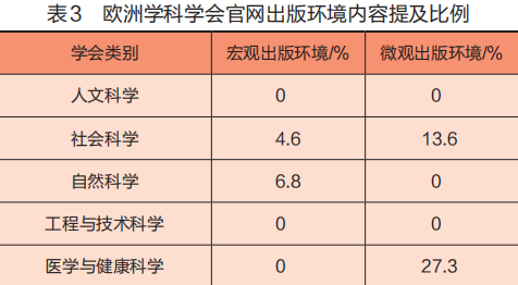 出版环境与学术出版活动间接相关,虽然并不属于出版流程的一部分,但是学术行为在很大程度上受到研究者所处环境的影响 [21],良好的出版环境对于维护学术出版质量和道德诚信至关重要。本研究中所指的出版环境包括微观环境与宏观环境两部分,有21个学会对其进行了描述。学会会员往往受雇于不同的高等教育机构或研究机构。学协会学术出版道德原则中的学术出版微观环境是对会员所属机构的建议,也是帮助会员判断当前学术出版环境是否有利于学术活动的指南。有6个社会科学学会和12个医学与健康学科学会在其指南中涉及学术出版道德微观环境(见表3)。