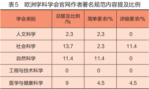 作者具有特殊权益(privilege)、责任(responsibility)与法定权利(legal rights)。[31]在学术领域,作者身份也是学术奖励和职业发展的基础。各个学科的作者身份规范和准则都有所不同。在人文和社会科学领域,独著比较常见,而在需要开展长期实验的学科中,多作者则较为常见。欧洲部分医学与健康科学类学会和自然科学类学会参考了国际医学期刊编辑委员会(International Committee of Medical Journal Editors,ICMJE)和开放存取学术出版协会(Open Access Scholarly Publishing Association)等组织发布的作者指南。有16个欧洲学科学会在其学术出版道德准则中对作者和署名者规范进行了或简单或详细的要求(见表5)。其中医学与健康学科的欧洲血液和骨髓移植协会和社会科学学科的欧洲社会人类学家协会根据自身学科特点做出格外细致的要求。欧洲血液和骨髓移植协会对作者身份的要求描述超过3000字(作者翻译的中文版本)。在医学界普遍接受的ICMJE规则的基础上,要求所有研究需要在正式开始前成立写作委员会,以对研究过程中可能出现的作者问题进行判断和协调。除了作者排序、每位作者应尽的义务之外,还详细地规定了进行合作研究时,统计人员、数据管理人员和研究协调员以及患者中心代表应该如何署名进行了规定。在社会科学领域,欧洲社会人类学家协会特别讨论了对于人类学研究涉及的大量实地工作及数据收集工作应该如何进行作者署名,并要求研究者参考献者角色分类法(contributor role taxonomy,CRediT)进行公平排序。在作者身份分配上,研究者之间的权利不平等是一个严重的问题。欧洲传播研究和教育协会也在其准则中特别指出了这一点。