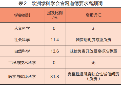 学术出版道德原则旨在强调科技论文作者应秉持的基本价值观,旨在对其行为进行指导。在我国学术出版道德规范中表现为要求研究人员要 “追求真理、诚实守信、实事求是、公平公正、互相尊重,保持严谨认真、一丝不苟的科学态度”。[18]在44个欧洲特定学科学会中的25个学会在其文件中概述了指导原则。不同学科在描述其道德原则时所使用的词语既有共同之处,也有明显的差异。研究者通过对文本内容的详细分析,总结了各个学科学会指导原则中使用频率最高的五个关键词(见表2)。