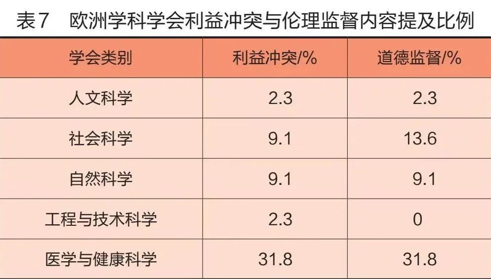 利益冲突(conflict of interest,COI)会在科学研究和学术写作中的每个阶段出现。在研究中可能会影响研究规划、分配资金、进行研究、解释数据、撰写文章,在出版过程中可能会影响同行评审、编辑决定和出版管理。[32]简而言之,利益冲突是干扰研究出版物客观完整性的任何影响因素,在全部学会中有24个学会在其文件中描述了利益冲突问题。如表7所示,医学与健康科学类学会提供利益冲突指南的比例远高于其他学科学会。医学与健康科学类学会在披露和处理利益冲突方面提供了最全面、最具体的建议。除了具体的操作之外,它们还通常会对遵守COI相关政策的理由进行解释,以证明其重要性。例如申明和避免利益冲突可以维护公众对医学研究实践的信任,“利益冲突会导致人们对科学家和科学事业产生有害的误解。当涉及巨额资金时,公众、立法者、司法系统甚至研究同行都很难相信研究结果没有因个人利益而有所偏颇。公众的怀疑可能会与真正的不当行为造成同样严重的后果”[33]。
