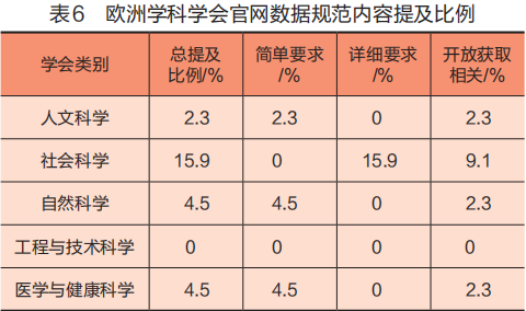 为了提高科学研究的透明度、信任度,更好地实现科学成果的可重复性和可验证性,学术界越来越希望作者可以通过提供相关数据对科学文本进行补充。制定数据存储、使用和共享的学术出版道德准则,已经成为国际学术界的共同举措。除了工程与技术科学类学会之外,其他学科学会都有相关准则(见表6)。但是只有7个欧洲学会在其与数据相关的学术出版道德准则中明确指出了要遵循开放科学规则。要求研究人员和研究机构确保对所有所有数据、元数据、协议、代码、软件和其他研究材料进行期限合理和明确的适当管理、整理和保存,同时保证科学数据访问符合FAIR原则,尽可能开放,必要时封闭。