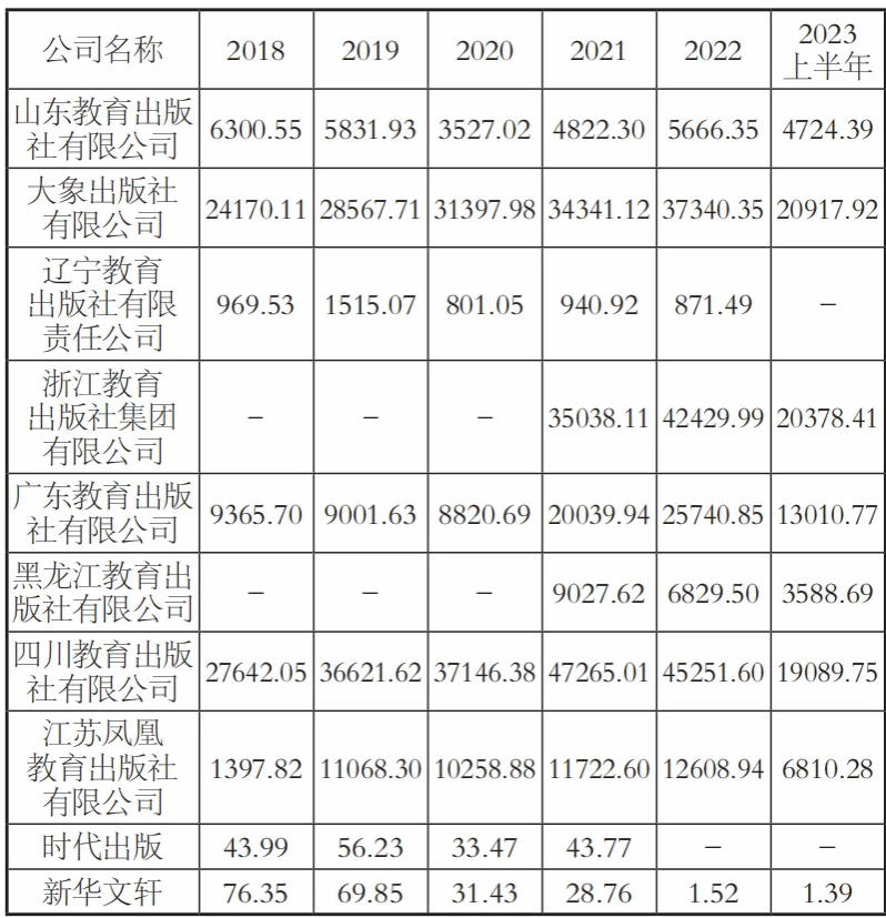 综合20家出版传媒上市公司历年财务报告披露的营收结构数据,梳理出版传媒上市公司旗下出版社对集团总营业收入的贡献情况,进一步挖掘出版传媒上市公司主业发展的内部结构,发现以下特征。一是新华书店体系和教育出版社体系在出版传媒上市公司营收中贡献较大,两者营收贡献加总超80%。如南方传媒旗下广东新华发行集团有限公司2022年净利润51 647.30万元,占公司总净利润的54.75%,2023年上半年净利润22 994.4万元,占公司总净利润的55.94%;广东教育出版社有限公司2022年净利润25 740.85万元,占公司总净利润的27.29%,2023年上半年净利润13 010.77万元,占公司总净利润的31.65%;龙版传媒旗下黑龙江新华书店集团有限公司2022年净利润32 279.83万元,占公司总净利润的67.54%,2023年上半年净利润5 282.68万元,占公司总净利润的41.27%;黑龙江教育出版社有限公司2022年净利润6 829.50万元,占公司总净利润的14.29%,2023年上半年净利润3 588.69万元,占公司总净利润的28.03%。二是出版传媒上市公司旗下不同出版社营收贡献差距较为悬殊,出版传媒上市公司主业发展的内部结构差异较大。如北方联合出版传媒旗下春风文艺出版社有限责任公司历年净利润情况是其他出版社的几倍,甚至部分出版社2022年净利润为负值,而春风文艺出版社净利润仍超过2 000多万。三是同一细分类别的出版社主业发展的净利润情况地区差异较大。如同样是教育出版社,2022年浙江、四川、广东、河南等地的教育出版社净利润在2亿元以上,而辽宁教育出版社2022年净利润则在数百万级别(见下页表3),浙江教育出版社、大象出版社2023年上半年的净利润已超2亿元,是黑龙江教育出版社的六倍。四是出版传媒上市公司旗下业务多元,在出版、发行、印刷等核心主业和投资、影视化等多元业务上均有经营业绩不佳、连年亏损的情况。如在发行主业上,辽宁新华书店发行集团有限公司2019—2022年净利润连续为负值,分别为-1 790.00万元、-3 981.86万元、-104.66万元、-65.78万元。在投资和影视化等其他多元业务上,城市传媒旗下青岛传媒发展有限公司的投资业务2018—2022年连续亏损年均数千万元,分别亏损5 836.52万元、7 378.53万元、6 721.85万元、6 771.39万元、6 246.43万元,且这种亏损趋势并未有效减缓,2023年上半年亏损3 086.05万元。青岛城市传媒影视文化有限公司在影视投资业务上,2022年亏损321.76万元,2023年上半年亏损53.6万元。
