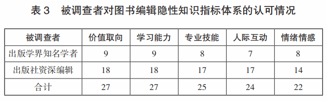 通过对图书编辑隐性知识指标体系的专家认可程度进行分析,绝大多数专家对本研究中所构建起的图书编辑隐性知识指标体系持认可态度,其中认可“价值取向”维度及“学习能力”维度的专家人数达到了100%(见表3)。专家们普遍认为图书编辑隐性知识指标体系中的每一个维度都非常重要,是图书编辑职业发展与个人成长的重要资源。