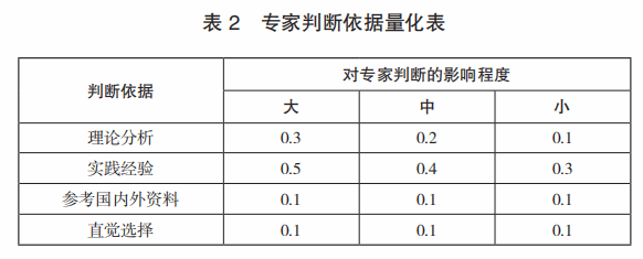 专家权威系数(Cs)是咨询结果可靠性的依据,一般由专家对方案作出判断的依据和专家对问题的熟悉程度两个因素共同决定。[13]其中,本研究采用的专家判断依据量化情况参见表2,由专家进行自我评价得出。专家对问题的熟悉程度量化情况为:若专家表示“很熟悉”,则赋值为1;若为“熟悉”,则赋值为0.8;“一般”熟悉度对应0.5;“不太熟悉”则为0.2;而“很不熟悉”则赋值为0。专家权威程度为判断系数和熟悉程度系数的算数平均值,计算公式为Cr=(Cα+Cs)/2。计算得专家权威程度为0.83,大于0.80,说明专家权威程度较高。