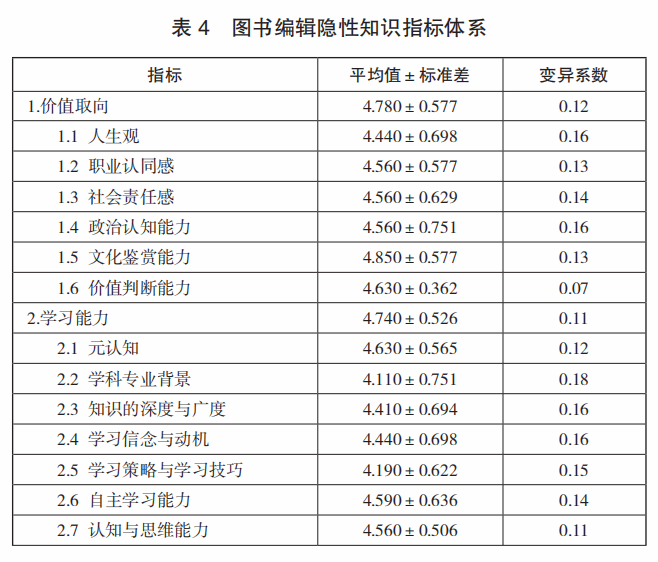 数据分析显示,图书编辑隐性知识指标体系中所有指标的变异系数都在合理范围之内,这说明专家们的观点趋向于一致。他们认为图书编辑隐性知识指标体系中的各个维度都很重要,这是判断图书编辑隐性知识水平的关键所在。