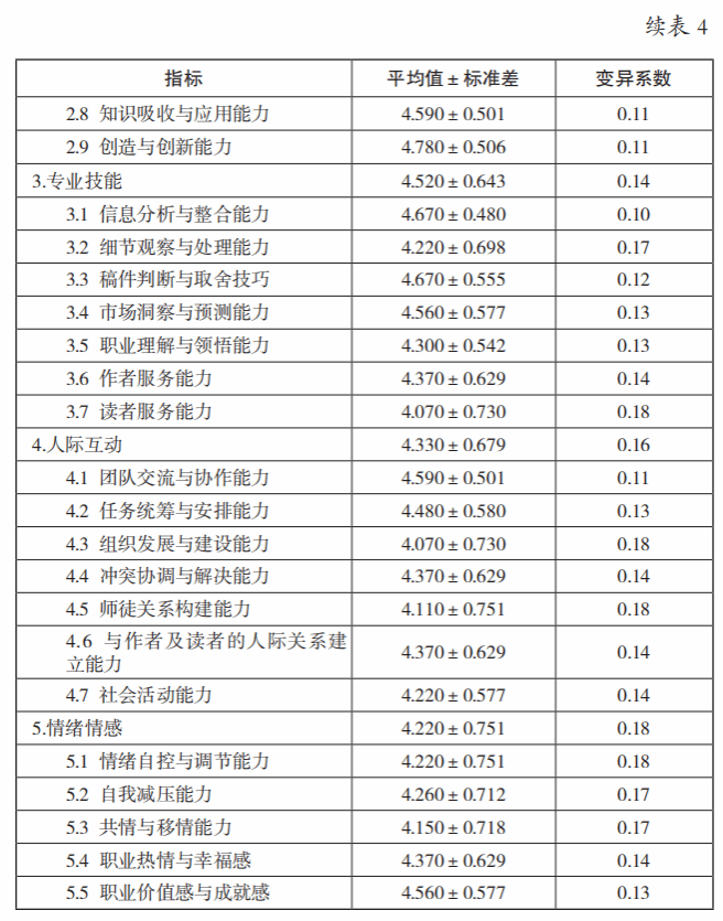 根据第一轮专家给出的修改建议,在“价值取向”维度下增加“文化鉴赏能力”;在“学习能力”维度下将“知识背景”修改为“学科专业背景”,将“学习技巧”与“学习策略”2个指标进行合并,并增加“知识的深度与广度”“自主学习能力”“认知与思维能力”“知识吸收与应用能力”以及“创造与创新能力”5个指标;“专业技能”维度,鉴于专家意见中强调“不同岗位、不同类别编辑的能力侧重点差异很大,不可一概而论”,于是将有争议的三个指标修改为更具有普适性的“职业理解与领悟能力”“作者服务能力”以及“读者服务能力”;并根据专家反馈意见,增加了“稿件判断与取舍技巧”指标和“市场洞察与预测能力”指标。“情绪情感”维度中,按专家建议增加“职业热情与幸福感”“职业价值感与成就感”2个指标。