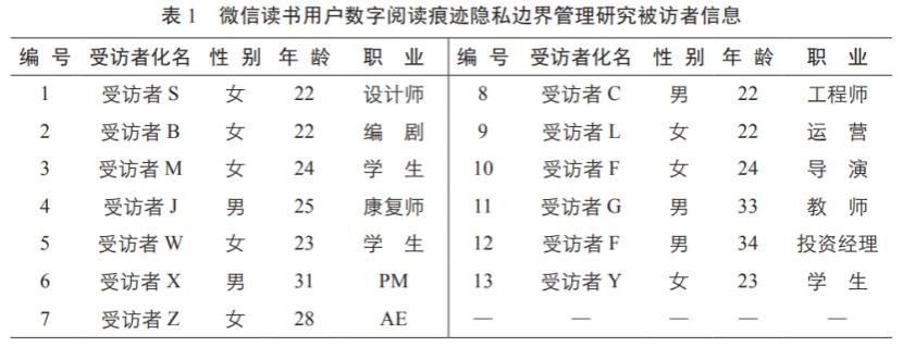 本文主要采用深度访谈法,通过滚雪球抽样及在社交平台公开招募的方式,遵循信息饱和原则,共对 13 位微信读书深度用户进行访谈,见表 1。通过深度访谈,掌握微信读书用户在管理阅读隐私时的行为习惯,比如个人书架公开,阅读评论互动、阅读时长排行等功能设置,并且对用户管理自身阅读隐私的行为动机与心理动态进行考察。在此基础上,研究还使用媒体报道、行业报告等获取微信读书相关公开资料作为辅助分析。