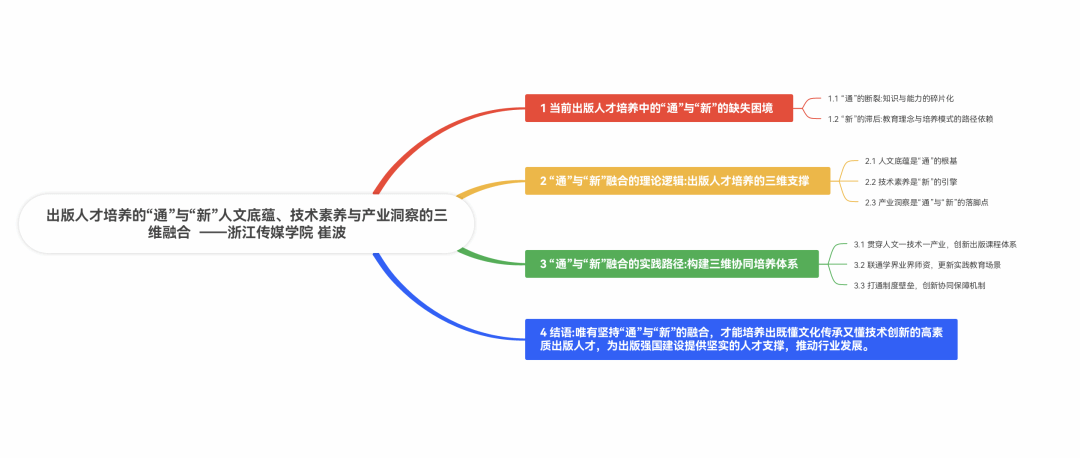 出版人才培养中的“通”与“新”并非割裂的维度,而是互为支撑、相辅相成的整体。“通”作为基础,确保在技术迅猛发展的背景下,人才不会迷失人文价值的引导;“新”作为动力,激励人才在坚守核心价值的同时,勇于探索和创新。通过课程体系的重构、实践模式的创新以及生态协同的保障,实现人文底蕴、技术素养与产业洞察的深度融合,既是响应出版业转型的现实选择,更是出版教育回归“培养人”本质的必然要求。