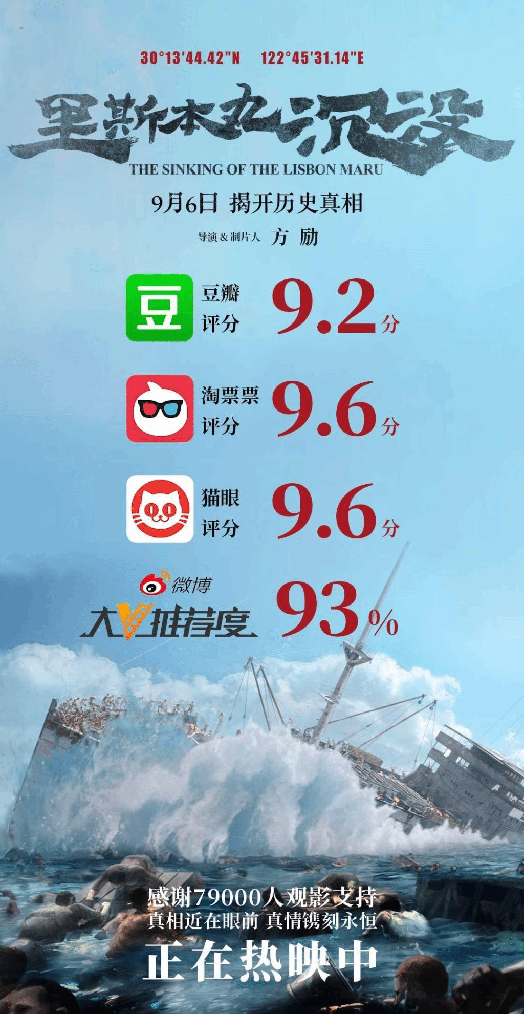 据悉,电影自9月6日上映以来,口碑持续高涨,赢得了全平台高分的好成绩——豆瓣开分9.2分,淘票票评分9.6分,猫眼评分9.6分,微博大V推荐度93%。数万名观众们的高度认同与力荐,也让影片在工作日实现了票房逆跌,并且平台预测票房连涨3天。为了支持这部八年磨一剑的诚意之作,近日,部分影城也开始自发支持这部电影,有的增加了排片,有的将长线放映《里斯本丸沉没》,人人都开始争当起了这段真相的“接棒人”,也进一步证明了《里斯本丸沉没》不仅是一部揭露历史真相的电影,更是一部能够深深打动人心的作品。